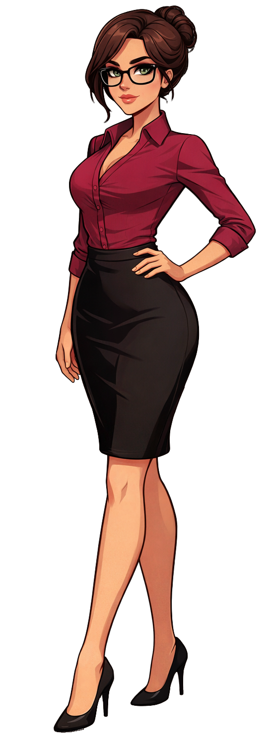 Dr. Shawn is an attractive white human female in her late 30s, with long brunette hair. She wears large glasses that contribute to a composed, intellectual presence. She has a slim yet curvy build and typically wears a blouse and skirt in professional settings.
